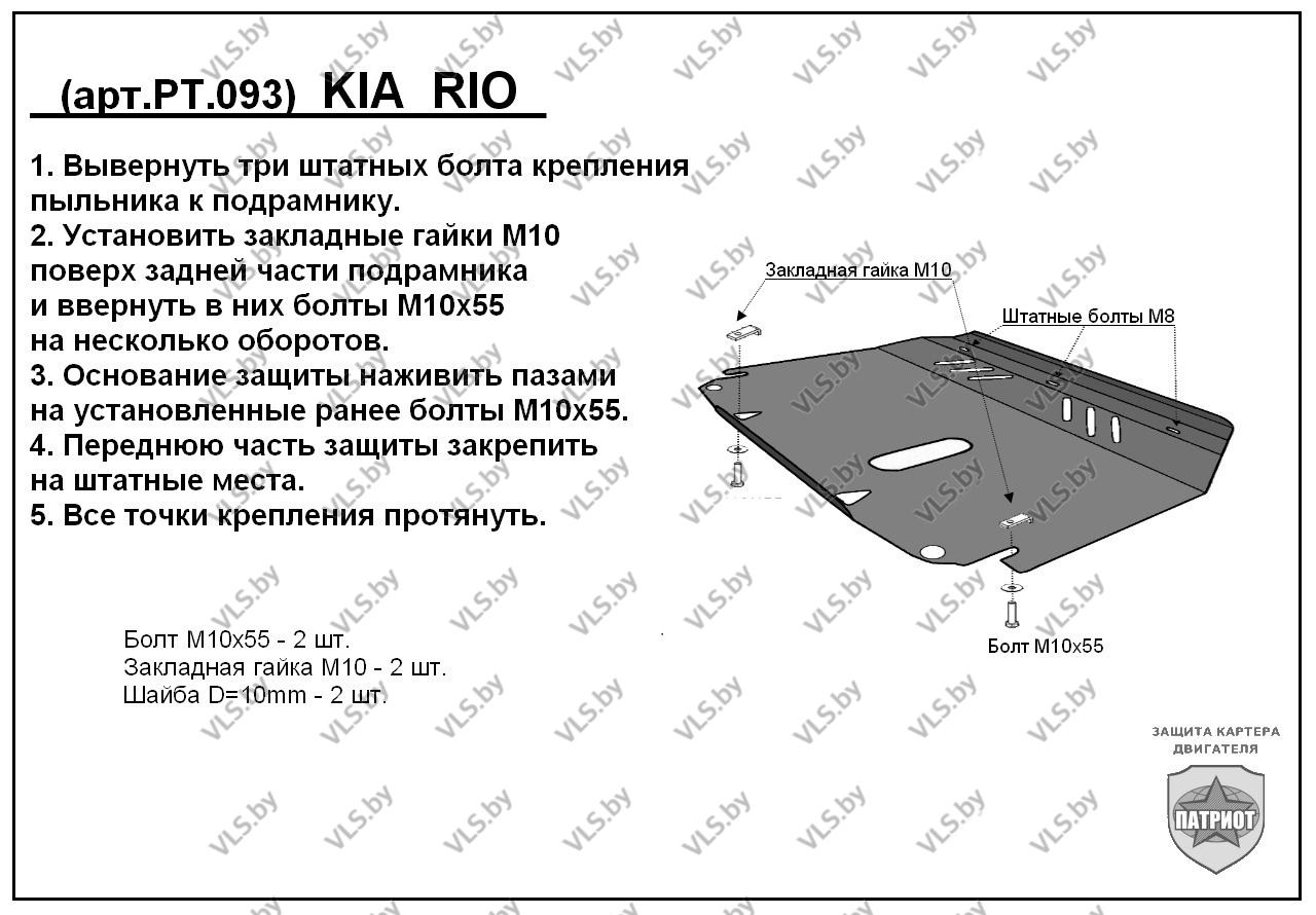 Комплект поставки состоит из защиты двигателя и КПП KIA оцинкованного крепежа и инструкции по установке.